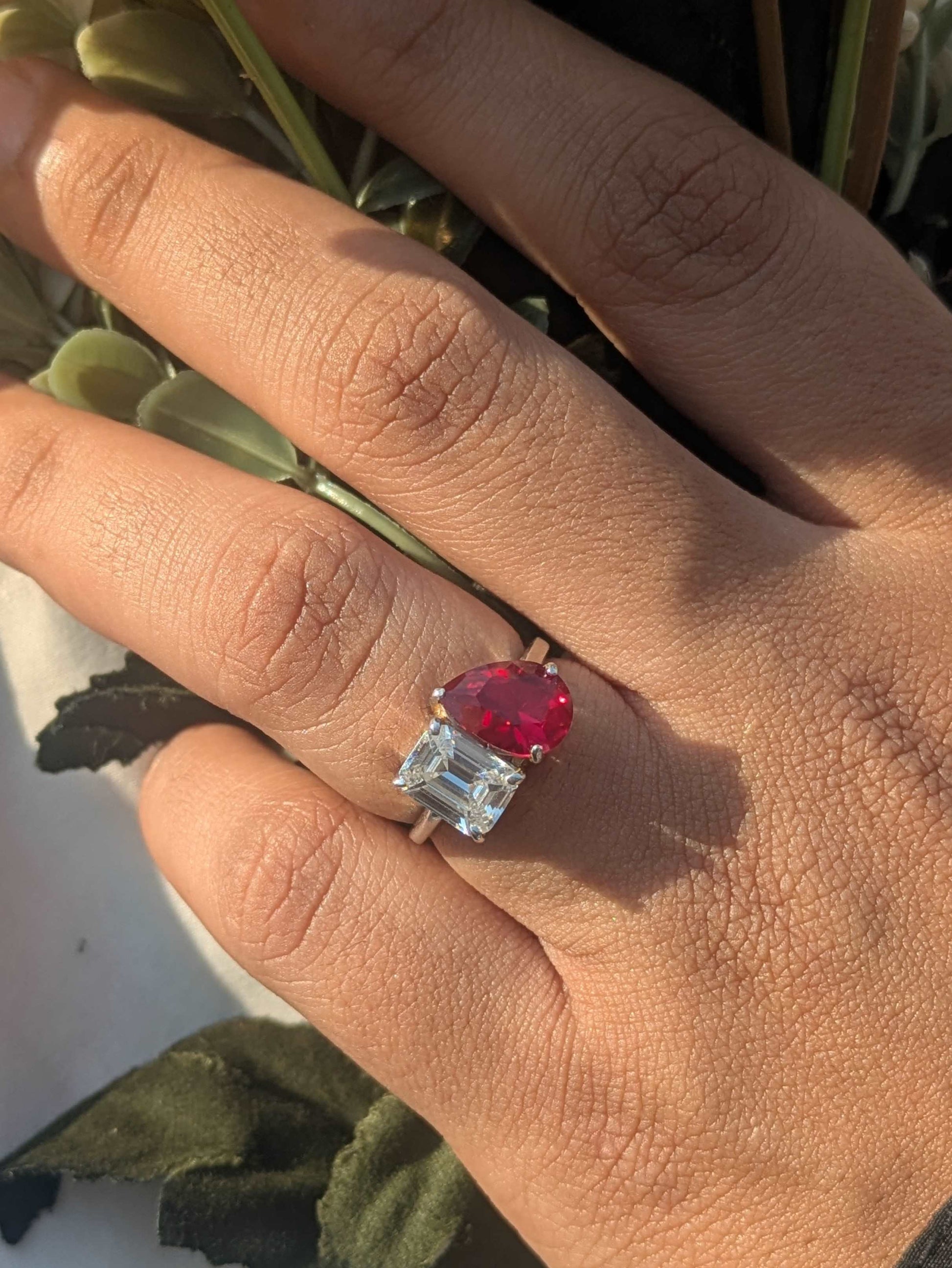 3.5Ct Red Ruby Pear & Emerald Toi Et Moi Silver Ring For Women