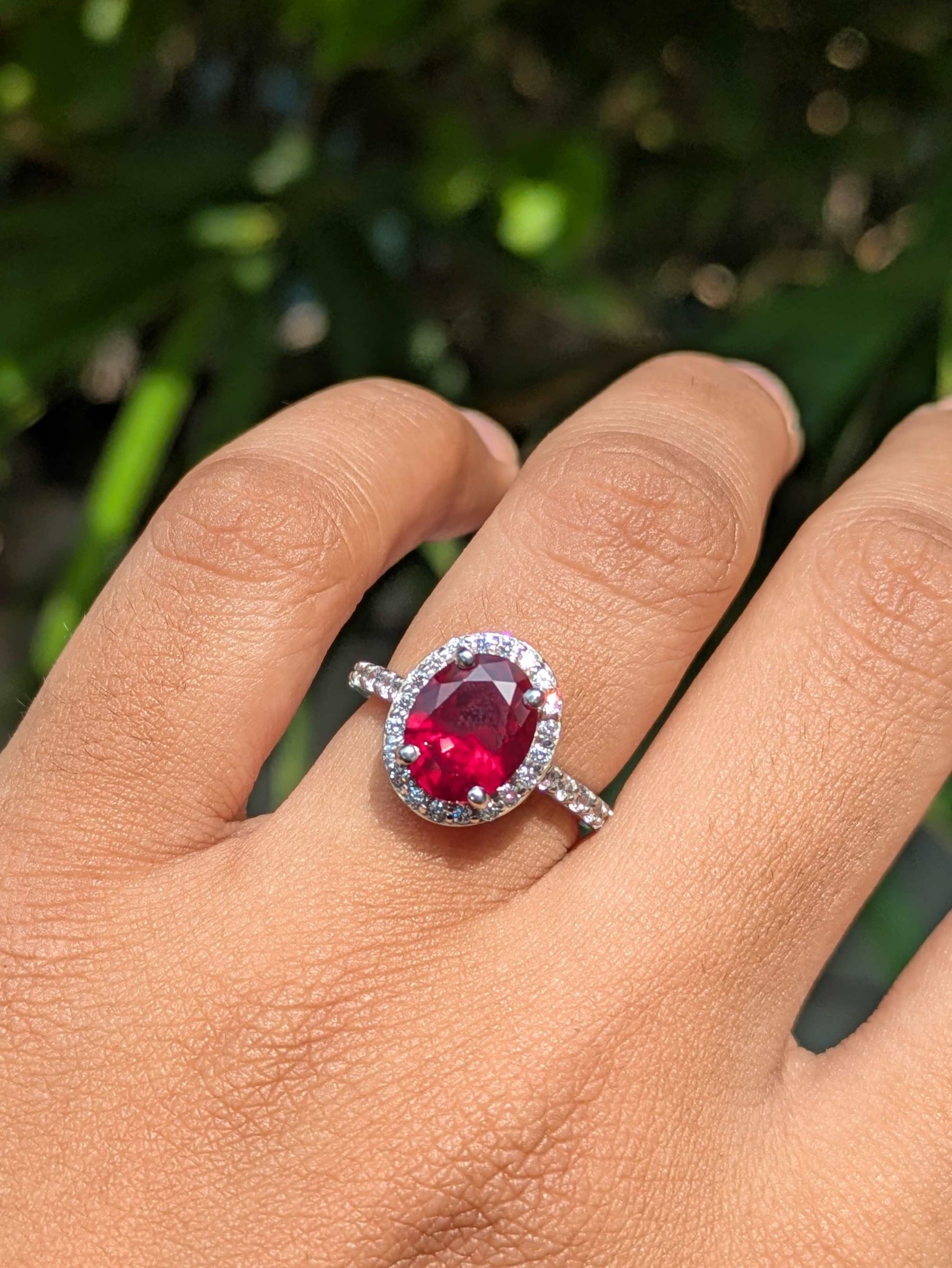 3Ct Scarlette Red Halo Oval Solitaire Silver Ring For Women